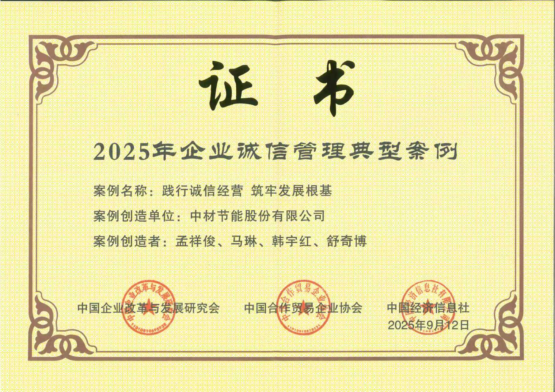泉源:集团执法合规部 宣布时间:2025-10-099月27日,,,,,,,,中国企业刷新与生长研究会、中国相助商业企业协会主理的“2025年企业诚信建设高质量生长大会”在福州举行。。。。。。。。6686体育 - 流通首播全球篮球足球热门赛事集团入选“2025年培育诚信谋划守信践诺标杆企业建议单位”,,,,,,,,集团所属中材节能股份有限公司、北新嘉宝莉涂料集团股份有限公司、山东瑞泰盖泽工程有限公司的案例荣获“2025年企业诚信治理典范案例”。。。。。。。。
