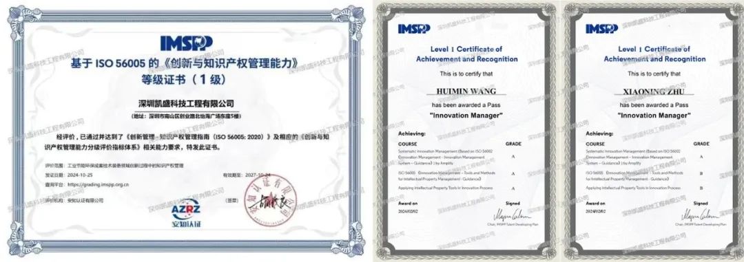 克日,,,,,,深圳凯盛获颁基于ISO56005国际标准的《立异与知识产权治理能力》1级证书,,,,,,同时公司2人获得国际认可的《立异治理师》证书,,,,,,这是公司在知识产权贯标事情方面的新突破,,,,,,标记着公司在立异治理中的知识产权标准化事情已接轨国际先进水平。。。。。。。。