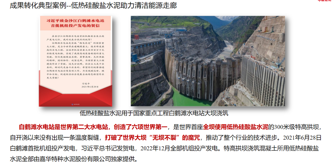 公司研发的低热硅酸盐水泥助力清洁能源走廊建设,,,,,,乐成应用于白鹤滩水电站和乌东德水电站,,,,,,突破了天下大坝“无坝不裂”的魔咒,,,,,,推动了整个行业的手艺前进。。。。。。。公司定制的G级油井水泥被“海洋石油981”深水钻井平台选定为固井专用油井水泥,,,,,,突破外洋油服公司的手艺垄断,,,,,,从而包管深水油气资源高效清静开采。。。。。。。
