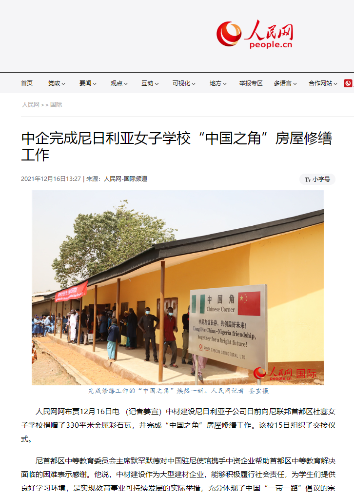 人民网报道 | 中企完成尼日利亚女子学校“中国之角”衡宇修缮事情