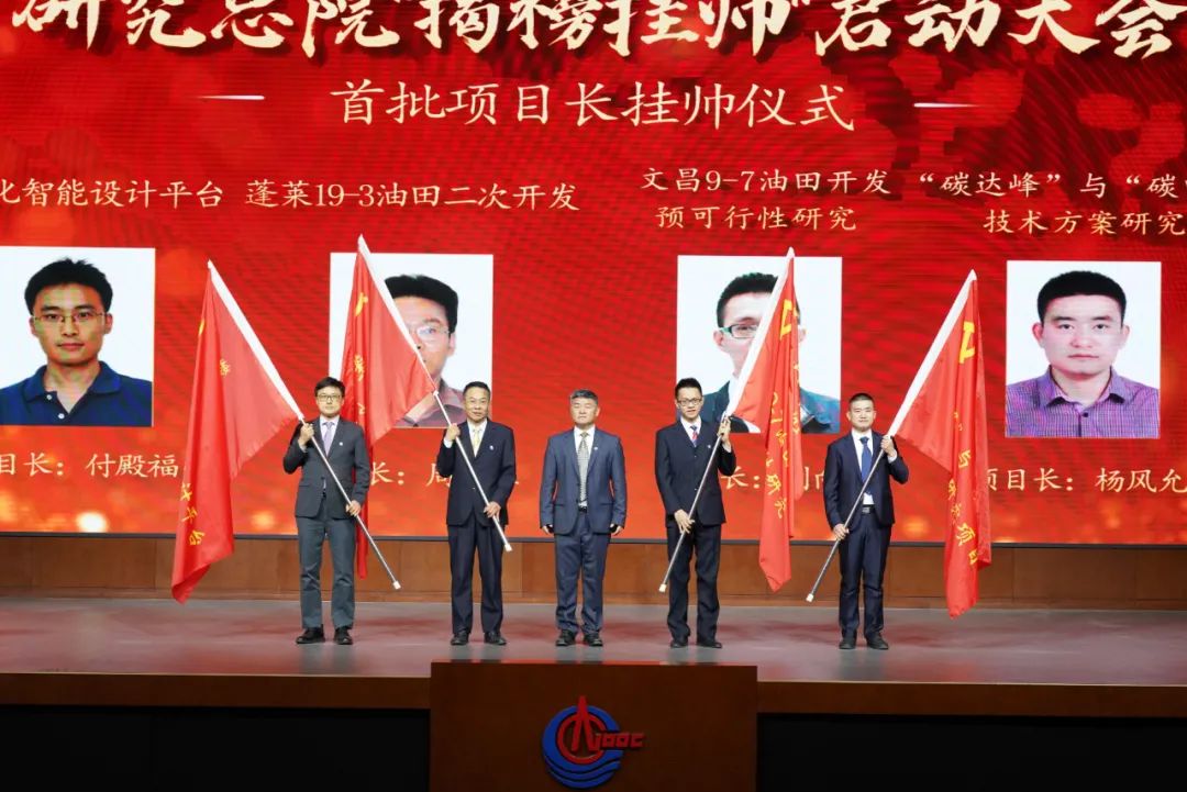 图为中国海油所属研究总院揭榜挂帅启动大会首批项目长挂帅仪式。。。。。。
