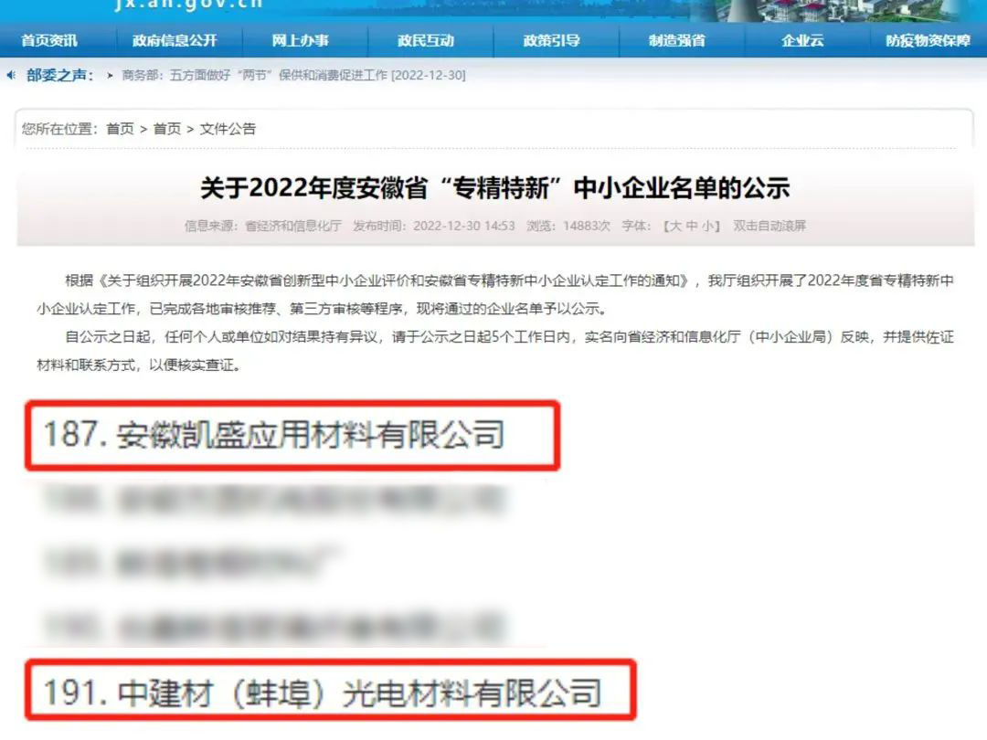 克日,,,,,,,,集团所属安徽凯盛应用质料有限公司、中6686体育 - 流畅首播全球篮球足球热门赛事(蚌埠)光电质料有限公司获得安徽省“专精特新”中小企业。。。。。。。。此次认定是对2家企业在立异能力、研发能力、手艺实力、专业化水一律方面的进一步认可,,,,,,,,对企业坚持自主立异、深耕手艺的高度一定。。。。。。。。