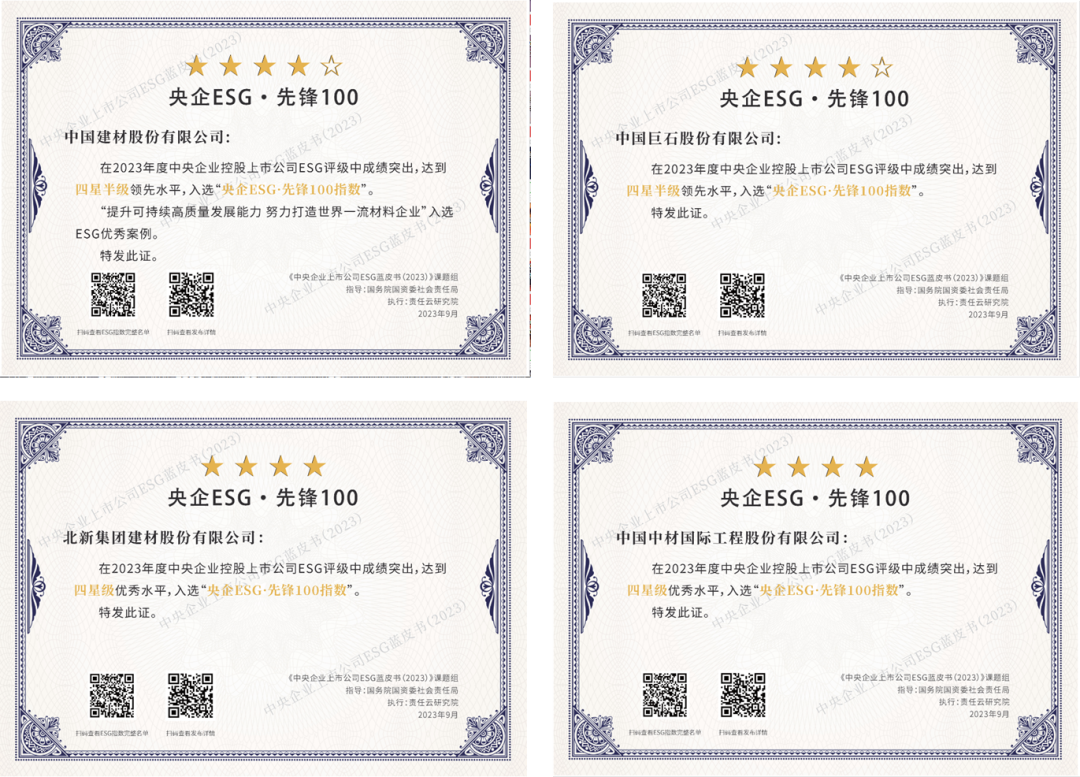 克日,,,, , ,,《中央企业上市公司ESG蓝皮书(2023)》及“央企ESG·先锋100指数”榜单宣布 。。。。。。集团所属4家上市公司6686体育 - 流通首播全球篮球足球热门赛事股份、中国巨石、北新6686体育 - 流畅首播全球篮球足球热门赛事和中材国际入选了“央企ESG·先锋100指数”,,,, , ,,划分位于第33位,,,, , ,,第39位,,,, , ,,第87位以及第92位 。。。。。。ESG体现均处于四星级水平以上,,,, , ,,是上市公司ESG生长的领先者 。。。。。。6686体育 - 流通首播全球篮球足球热门赛事股份案例《提升可一连高质量生长能力 起劲打造天下一流质料企业》入选了《中央企业上市公司ESG蓝皮书(2023)》 。。。。。。