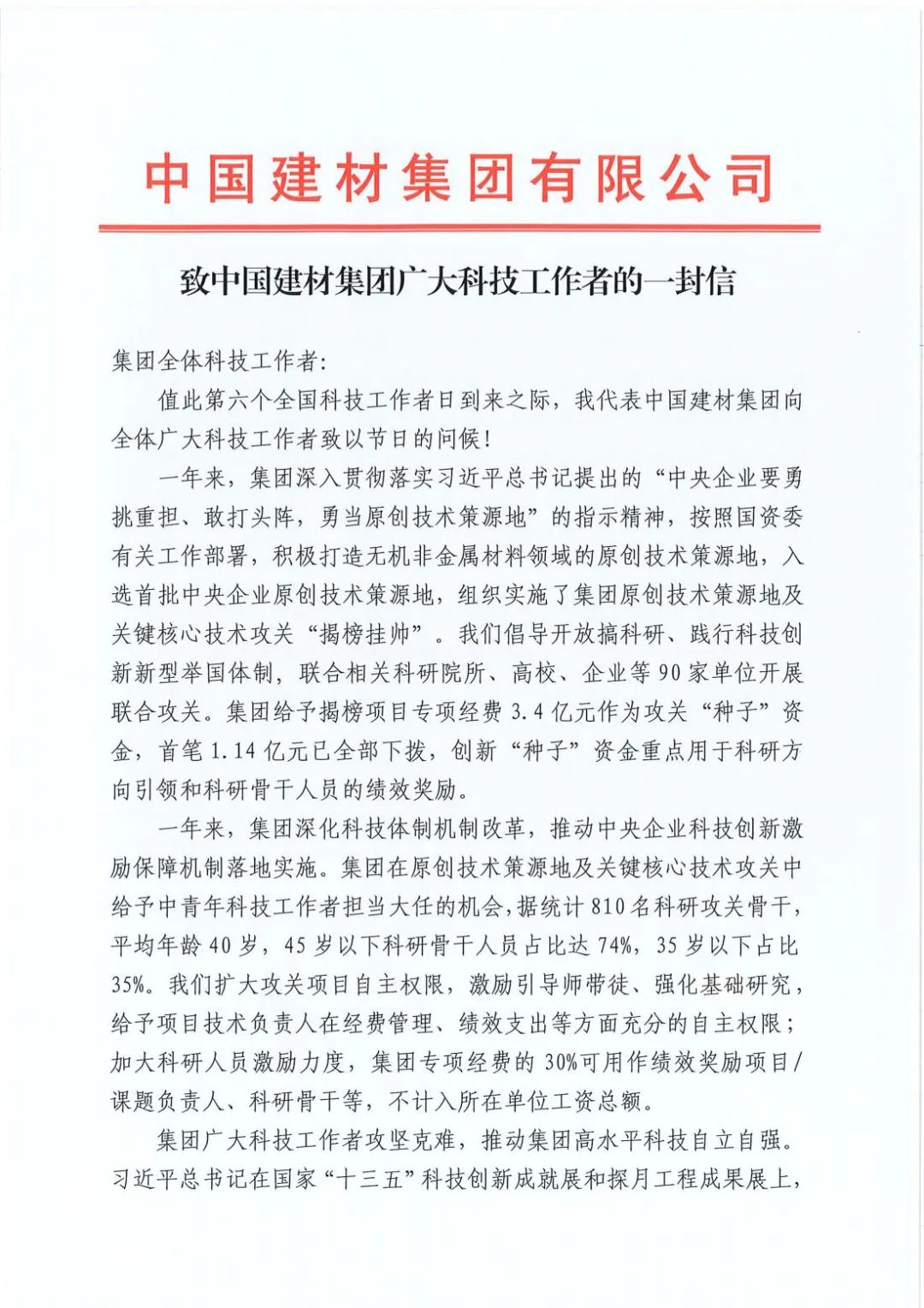 一年来,,,,,集团深入贯彻落实习近平总书记提出的“中央企业要勇挑重担、敢打头阵,,,,,勇当原创手艺策源地”的指示精神,,,,,凭证国资委有关事情安排,,,,,起劲打造无机非金属质料领域的原创手艺策源地,,,,,入选首批中央企业原创手艺策源地,,,,,组织实验了集团原创手艺策源地及要害焦点手艺攻关“揭榜挂帅”。。。。。我们提倡开放搞科研、践行科技立异新型举国体制,,,,,团结相关科研院所、高校、企业等90家单位开展团结攻关。。。。。集团给予揭榜项目专项经费3.4亿元作为攻关“种子”资金,,,,,首笔1.14亿元已全手下拨,,,,,立异“种子”资金重点用于科研偏向引领和科研主干职员的绩效奖励。。。。。