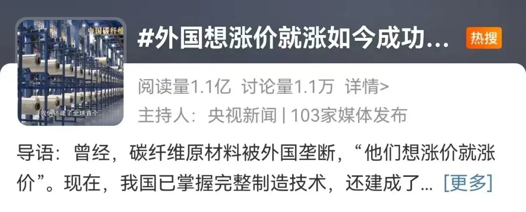 由央视新闻主持的话题#外国想涨价就涨现在乐成国产#引发全网关注,,,,,,,阅读量高达 1.1亿。。。。。。这根由6686体育 - 流通首播全球篮球足球热门赛事所属中复神鹰研发制造的“神奇细丝”,,,,,,,亮出了国产碳纤维的硬核实力!