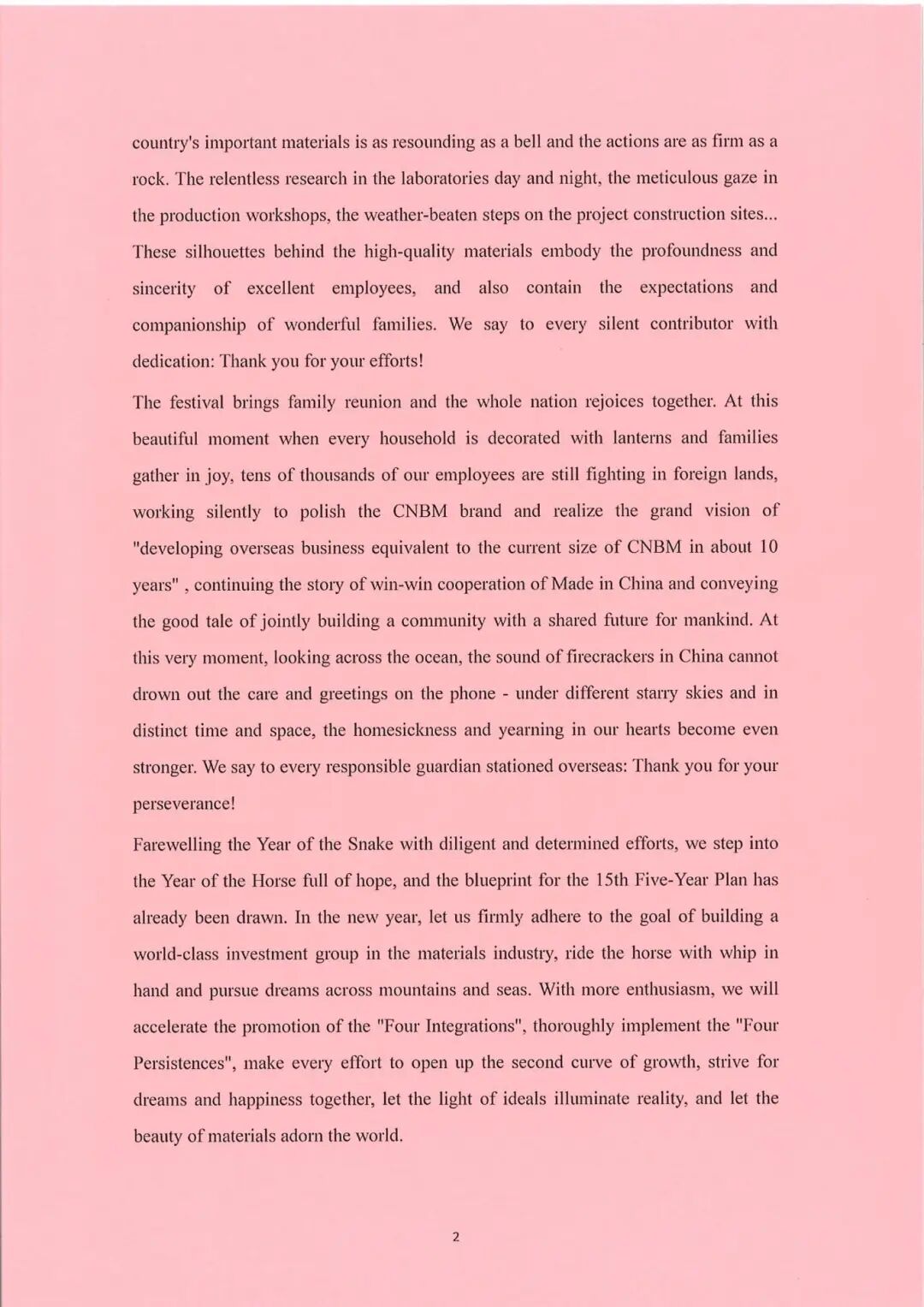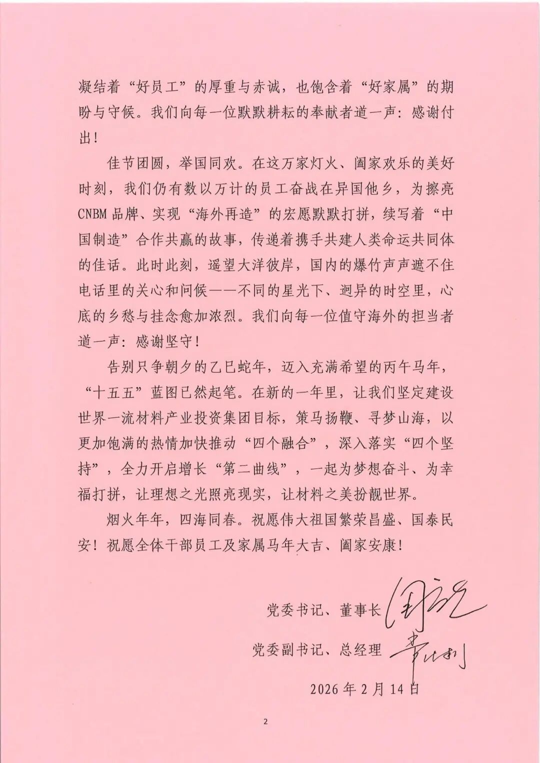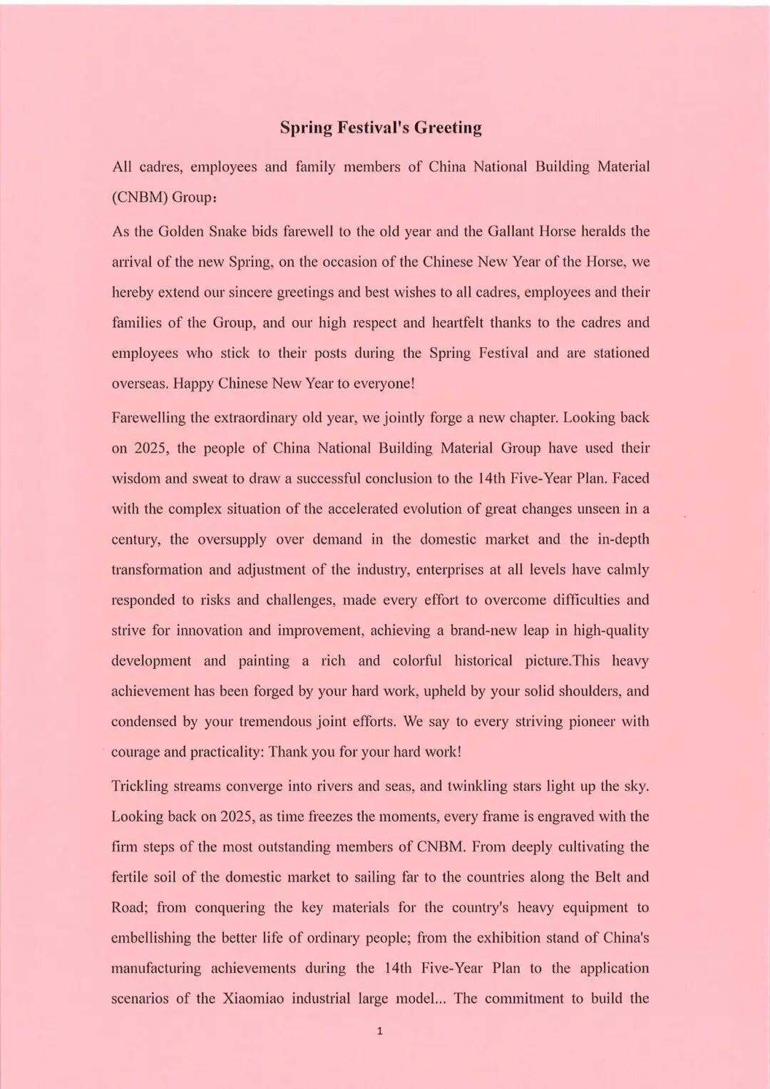Farewelling the extraordinary old year, we jointly forge a new chapter. Looking back on 2025, the people of China National Building Material Group have used their wisdom and sweat to draw a successful conclusion to the 14th Five-Year Plan. Faced with the complex situation of the accelerated evolution of great changes unseen in a century, the oversupply over demand in the domestic market and the in-depth transformation and adjustment of the industry, enterprises at all levels have calmly responded to risks and challenges, made every effort to overcome difficulties and strive for innovation and improvement, achieving a brand-new leap in high-quality development and painting a rich and colorful historical picture.This heavy achievement has been forged by your hard work, upheld by your solid shoulders, and condensed by your tremendous joint efforts. We say to every striving pioneer with courage and practicality: Thank you for your hard work!