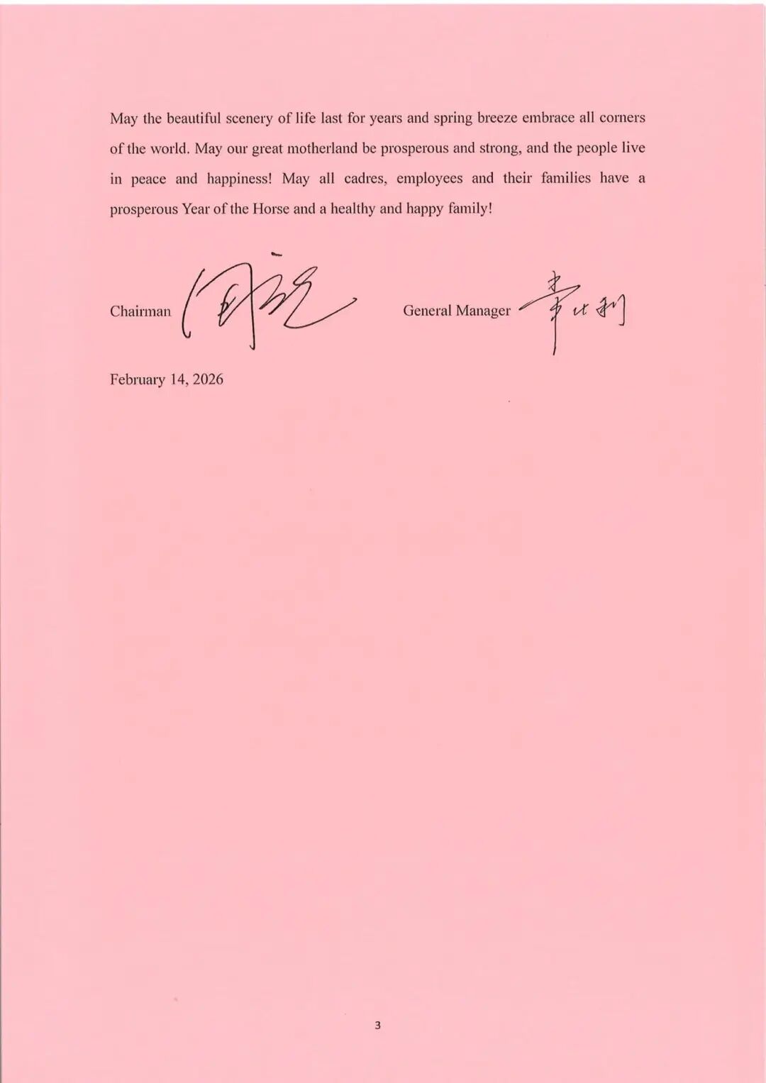 As the Year of the Snake draws to a close and the Year of the Horse approaches, we hereby extend our sincere greetings and best wishes to all cadres, employees and their families of the Group, and our high respect and heartfelt thanks to the cadres and employees who stick to their posts during the Spring Festival and are stationed overseas. Happy Chinese New Year to everyone!